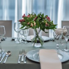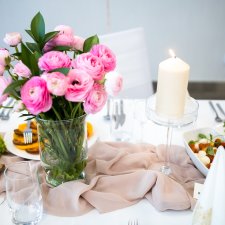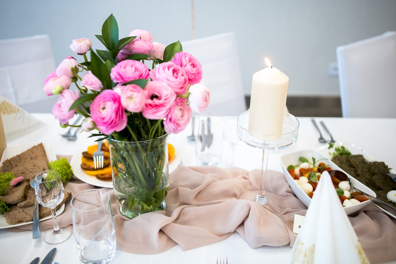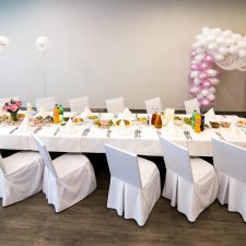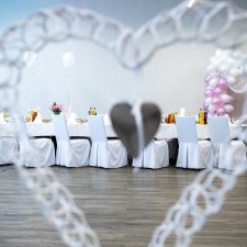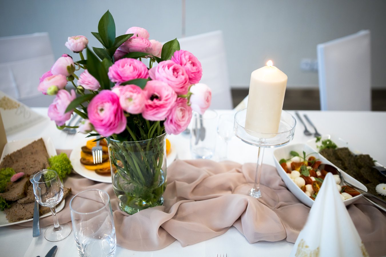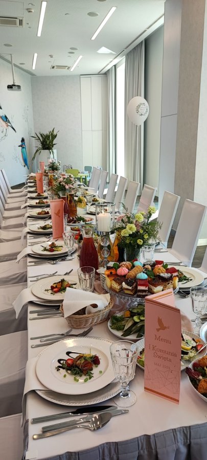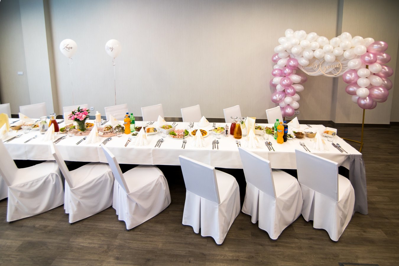 • aranżację sali i stołów ( w cenie białe obrusy, pokrowce na krzesła, świeże kwiaty, świeczniki, podtalerze, serwetki)