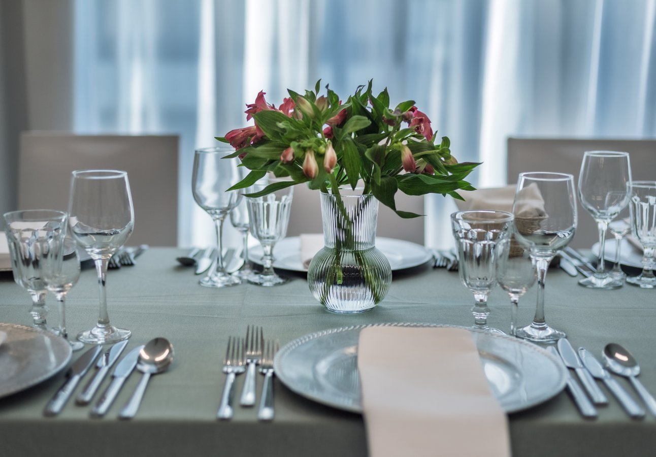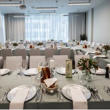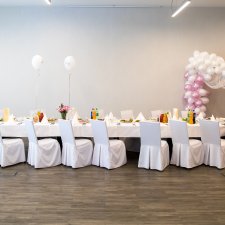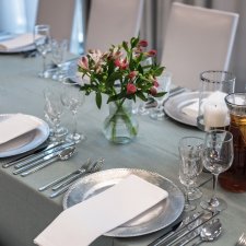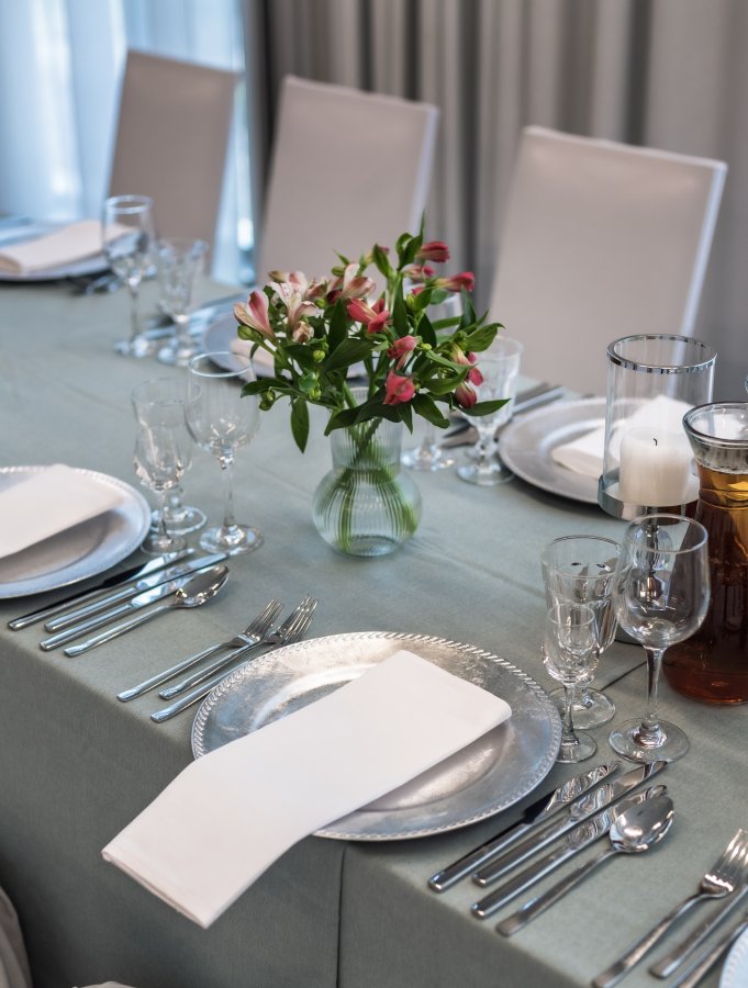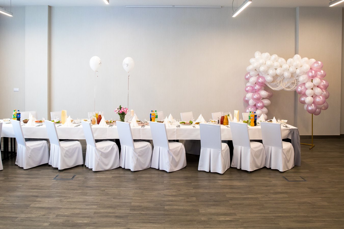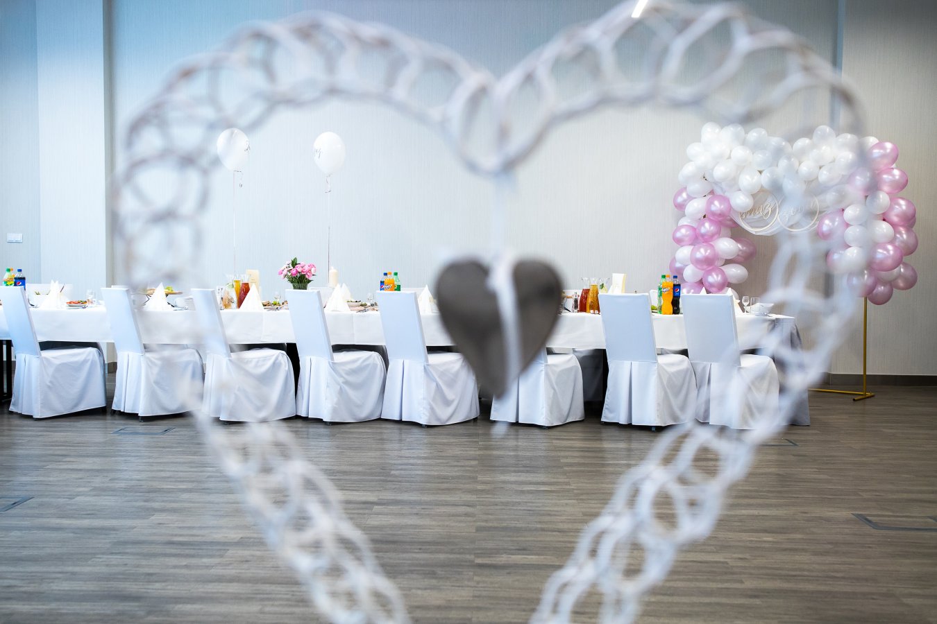• aranżację sali i stołów ( w cenie białe obrusy, pokrowce na krzesła, świeże kwiaty, świeczniki, podtalerze, serwetki)